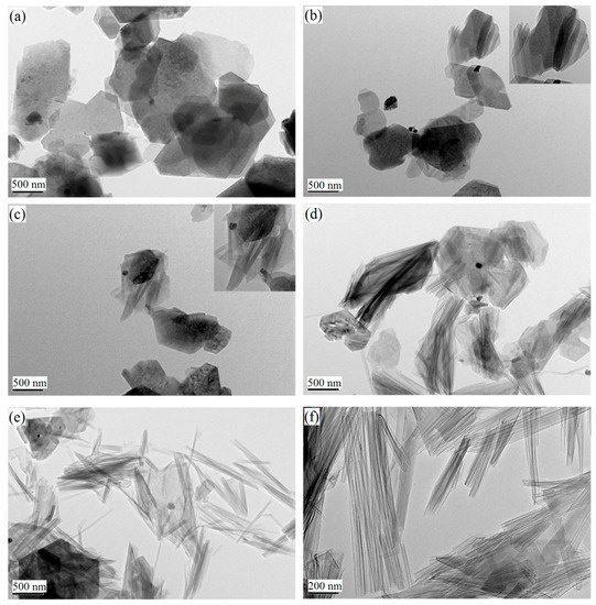The transformation process of the kaolinite morphology from layer sheets to nanoscrolls by intercalation and exfoliation treatment has been reported by previous literatures. However, the effect of the guest species’ type and alkyl chain length on the change in the kaolinite morphology has not been reported. TEM images of K and K-Qas with different alkyl chain lengths are illustrated in Figure 3. As indicated by the TEM image of K, the raw kaolinite is mainly composed of a typical pseudo-hexagonal morphology (Figure 3a). After the intercalation with K-Qas, the morphological changes of kaolinite are clearly evident in the TEM images (Figure 3b–f). The TEM images of K-Qa-C4 and C6 products both show the mere existence of partially curled kaolinite layers. At a higher magnification, it was clearly found that some semi-closed tubes exist in K-Qa-C6, which indicates that the kaolinite layers were more easily exfoliated when intercalated with butyltrimethylammonium chloride. As the chain length increased, the curl degree of kaolinite sheets increased and some kaolinite sheets even curled into nanoscrolls. Moreover, the initial kaolinite particles were mostly transformed to nanoscrolls in the product prepared with stearyl trimethyl ammonium chloride (STAC; Figure 3f). Although the validity of the summary of morphological data was limited by characterizations in the microscopic observations, the change trend of the kaolinite morphology was sufficiently clear to examine the effect of the alkyl chain length on the transformation of the kaolinite morphology.