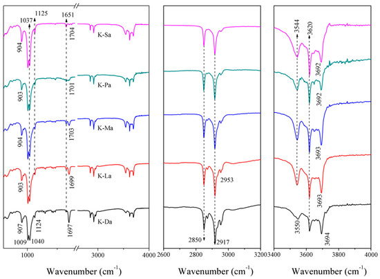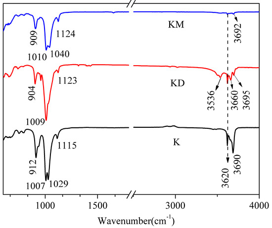 FTIR spectra of K, K-D, and K-M.