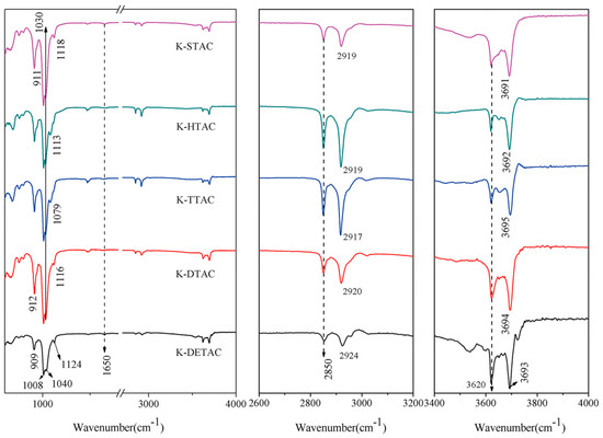 The IR bands in the range of 900–912 cm−1 correspond to the bending vibration peak of the internal surface hydroxyl group of kaolinite. Compared with the starting kaolinite (Figure 5), the bending vibration bands of Al–OH shifted to a low wavenumber in the spectra of K-Fas, and their intensities decreased. However, there were slight changes for K-Qas. These differences indicated that the fatty acids had more influence on the surface hydroxyl group of kaolinite than the quaternary ammonium salts. In other words, the interaction between the carboxyl groups of the fatty acid and the inner-surface hydroxyl groups of kaolinite was stronger.