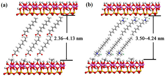 The interaction of intercalator groups with internal and surface layers of kaolinite can be determined according to the distribution of intercalator molecules between kaolinite lamellas. The distribution patterns of the fatty acid and quaternary ammonium salt molecules in kaolinite lamellas are shown in Figure 8. Combining with FTIR analysis results, quaternary ammonium salt molecules interact with both internal surface hydroxyl groups of kaolinite and Si–O at the bottom of kaolinite lamellas. On the one hand, for ion groups of quaternary ammonium salts, it is easy to form a new acting force with Al–OH through a hydrogen bond. On the other hand, Si–O is negatively charged and attracts positive ion groups through electrostatic force. Carboxylate radical ions of fatty acid are negatively charged, thus repelling Si–O mutually, but interact with hydroxyl groups of kaolinite. Although both anionic (fatty acid) and cationic (quaternary ammonium salt) molecules present a bilayer inclining distribution, –COO– in the anionic intercalator mainly interacts with internal surface hydroxyl groups of kaolinite, while positive ions at the N-end of the cationic intercalator interact with both internal surface hydroxyl groups of kaolinite and the Si–O bond of the silica tetrahedron of kaolinite. Meanwhile, some methyls will enter into ditrigonal pyramid caves of kaolinite silica tetrahedron. Compared to anionic guest species, it is easier for a cationic species to destroy the hydrogen bond between kaolinite lamellas. Particularly, positive ion groups of two layers of quaternary ammonium salt molecules interact with both silica tetrahedron faces and alumina octahedron faces between kaolinite lamellas, enabling the cutting of bonds of Si–O and Al–OH. Furthermore, the interface between two layers of quaternary ammonium molecules is the adjacent surface of like ions that repel mutually. Therefore, the interlamellar binding force of kaolinite disappears gradually with the widening of the interlamellar spacing. As a result of the distortion force caused by structural dislocation, kaolinite lamellas curl up into tubes. Fatty acids not only have a hydrogen bond force and a weak electrostatic attraction between their radicals (carboxyl and methyl) and internal surface groups of kaolinite, but they also have a weak hydrogen bond force between them. Such forces reach a balance state with the distortion force caused by the structural dislocation of kaolinite and connect lamellas together, thus enabling the anionic intercalator to keep its lamellar structure.