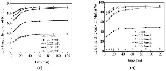 The manganese dioxide in semi-oxidized manganese ore could not be directly leached with sulfuric acid without reductant. The effects of sucrose concentration on the leaching efficiencies of TMn, MnCO3 and MnO2 were investigated in the range of 0.015 to 0.045 mol/L at the initial sulfuric acid concentration of 5 mol/L and temperature of 363.2 K to improve the leaching efficiency of manganese. The results are presented in Figure 3. Without adding sucrose, the leaching efficiency of TMn had a sharp increase in the first 45 min of the reaction (Figure 3b). Then, the leaching efficiency of TMn increased slightly from 36.5% to 38.2%. The efficiency of MnCO3 was reciprocated by a similar sharp increase in TMn (Figure 3a), thereby suggesting that MnCO3 could be easily extracted by sulfuric acid without reductants [24]. Although approximately 5% MnO2 was decomposed, the possibility was that the Mn2+ released from MnO2 would be apparently based on the small quantities of ferrous or biomass in ores that could be used as reductants [25]. The leaching efficiency of TMn increased dramatically with the increase of sucrose concentration from 0.015 mol/L to 0.035 mol/L. However, this increase was not remarkable in the later concentration of 0.035–0.045 mol/L with a slight augmentation in the leaching rate from 92.4% to 92.9%. Nearly 8% of TMn also remained in the leaching residues that included 7.3% MnO2 and 2.2% MnCO3. These observations demonstrated that the two manganese phases could not be recovered completely. Table 1 shows that 37.7% of silica existed in the semi-oxidized manganese ore. This finding implied that gangue encapsulation might be the main reason that restricts manganese from being leached. The leaching efficiency of MnCO3 rose slightly within a narrow range from 93.1% to 97.4% when the sucrose concentration reached 0.025 mol/L. This slight increase was the result of the exposure of MnCO3, which was encapsulated in MnO2, in the leaching process and then by its reaction with sulfuric acid. Then, the increase in the sucrose concentration had no significant effect on MnCO3 leaching efficiency. However, even if the phases of MnO2 and MnCO3 could be recovered completely under the aforementioned conditions, the approximately 2% TMn that remained in the ores could not be leached. This observation confirmed that some other manganese phases could not be dissolved easily in an acid solution with a reductant. Therefore, the optimal sucrose concentration should be 0.035 mol/L to leach manganese from the semi-oxidized manganese ore as completely as possible, and to decrease the sucrose concentration. This optimal sucrose concentration corresponded to the TMn leaching efficiency of 91.8%, including 91.4% for MnO2 and 96.9% for MnCO3 dissolved in 60 min. This sucrose concentration was used in all subsequent experiments.