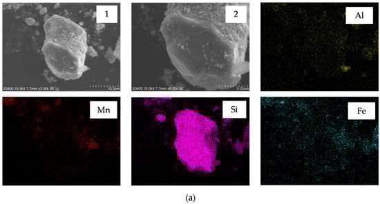 Figure 6 (a1,a2) shows that the particle of ore had smooth surface morphology, whereas those etched with H2SO4/sucrose had rough surface and many micropores in the surface after leaching (Figure 6 (b1,b2)). The EDS element mapping (seen in Figure 7) also demonstrated that Mn, Al and Fe elements had obviously different distributions in original ore and leaching residue. Figure 6b shows that the distribution of Mn, Al and Fe was lower than that of the element in ore, particularly Mn. This observation indicated that these elements dissolved after leaching in acid medium with reductant [12]. The dissolution of partial Fe agreed with the result of Section 3.1, that approximately 5% MnO2 was decomposed without a reducing agent. Nevertheless, the leaching experiments also showed that approximately 8% of TMn could not be leached with high acid consumption and excessive reductant. The comparison of Figure 6a,b indicated that the particles of ore had not appeared to fracture after leaching, which might have resulted in incomplete leaching.