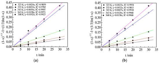 In the range of 5–30 min, the leaching efficiency values yield sensible rate measurements, so it was convenient for studying the leaching mechanism through kinetic data and may be exploited for industrial application. This article mainly studied the dynamic behavior when the leaching tests started in 5 min. The experimental data (Figure 5) were correlated with various kinetic models (Equations (4)–(6)) for solid–liquid reactions to obtain the kinetic equation and apparent activation energy. The following diffusion-controlled kinetic equation (Equation (6)) was found to fit the data best with a correlation coefficient greater than 0.97. The results are shown in Figure 9.
