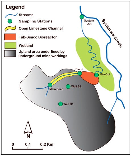 Recently, considerable interest has focused on designing remediation technologies of acid mine drainages (AMD), which often contain excessively high concentrations of SO42− [12,13,14]. Engineered passive bioremediation systems (PBS) have been proposed as a low-cost, environmentally sustainable option for remediating AMD at metal and coal mining operations [5,12,13,14]. Preventing the direct mobilization of contaminants from the mine waste is the preferred approach in AMD mitigation; however, in many instances, such as in the case of many abandoned coal mines, there are large uncertainties in the locations of old mine workings and thus underground flooding and sealing is not a viable option [5]. In the Illinois Basin, several engineering designs for PBS have been developed in the recent years. Such systems have used low-cost, locally available materials and consist of gravity-flow systems such as wetlands, oxidation ponds, low-pH iron oxidation cells/open limestone channels, and anaerobic sulfate reducing bioreactors [5,15,16].