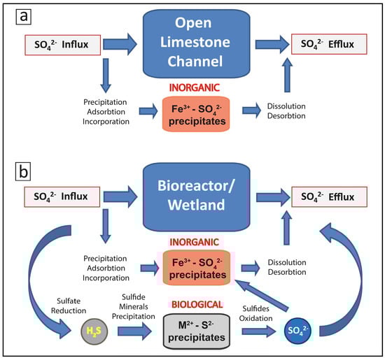 Simplified sulfur cycling and sequestration in a typical passive bioremediation system components: (a) the open limestone channel; and (b) the bioreactor and/or the wetland.