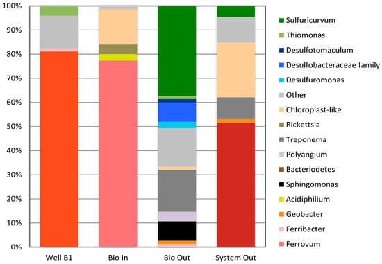 As the AMD moved from the underground mine system to the bioreactor (Figure 1), the community remained dominated by Fe-oxidizing bacteria (Figure 3). However, the predominant Fe oxidizer shifted to one related to a Ferrovum, a genus that has also been detected in a wide range of AMD sites [39,40,41,42,43]. This community analysis also suggested limited biological S cycling in the pretreated AMD drainage as only 2% of the analyzed sequences were related to a potential S oxidizing Thiomonas species and no sequences related to S or SO42− reducers were detected (Figure 3). As the treated mine drainage was released from the bioreactor, the community strongly shifted away from one dominated by Fe oxidizers to one supporting biological S cycling. Organisms related to species capable of S and SO42− reduction, including the anaerobic Desulfuromonas (S reducer), Desulfotomaculum, and Desulfobacteraceae (family) were detected in the Bioreactor Outlet sample (Figure 3). In conjunction with the presence of reduced S species in the bioreactor, sequences related to the S oxidizer Sulfuricurvum were detected in abundance. Some species of Sulfuricurvum have been shown to completely oxidize S0, sulfide, or sulfite to SO42− and thrive in high-sulfide, low oxygen microenvironments [44]. As the AMD from the bioreactor travelled through the oxidation pond/wetland, the community in the effluent shifted back to one that was similar to the Bioreactor Inlet, in that it was dominated by Fe oxidizing bacteria and chloroplast-like sequences. However, the predominant sequence type detected was more closely related to the Fe-oxidizing genus Sideroxydans. While some acidophilic Sideroxydans species have been isolated, others are limited to circumneutral pH [45]. Thus, the Fe oxidizer phylotype shifts are most likely linked to the pH of the sample sites. It should be noted that ~4.5% of the sequences detected in the System Outlet sample were still related to the S oxidizer Sulfuricurvum species, thus suggesting the remaining presence of some reduced S species as an electron source.