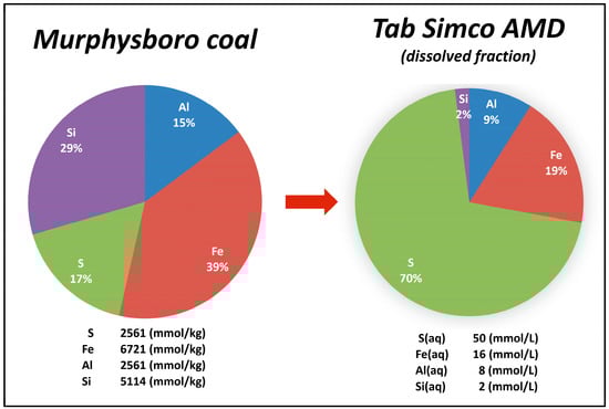 At Tab-Simco, the AMD overall chemistry reflects the composition of Murphysboro and Mt. Rorah coals; however, the component ratios are dissimilar (Figure 4). In coal, which contains high amounts of clay minerals and quartz, Al and Si predominate, whereas, in AMD, SO42− is the dominant dissolved species followed by Fe, Al and Si [49]. Likewise, even though S represents only ~17% of the inorganic molar fraction in Murphysboro coal samples, it makes up ~70% of the total dissolved load in Tab-Simco AMD [18] (Figure 4). This discrepancy is due to weathering patterns of coal and coal mining waste as well as to specific methods employed to measure contaminant transport in AMD. In coal, weathering of pyrite and other S-bearing compounds generate coal mine drainages enriched in SO42− and metals such as Al, Fe, Mn, Zn, Ni and Cr. However, SO42− sequestration is typically low in the coal mine waste, since most of the SO42− bearing minerals (e.g., gypsum, jarosite and schwertmannite) are relatively unstable and prone to dissolution, which promotes SO42− partition into the AMD [49].