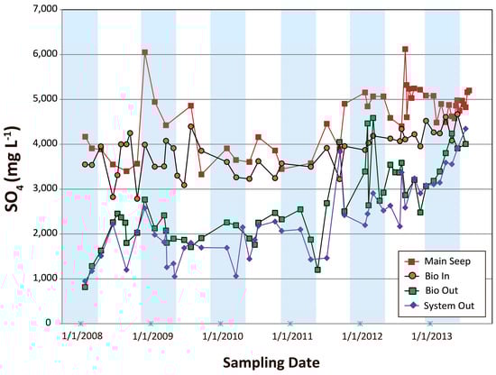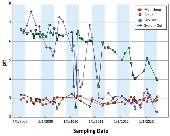 The effluent pH measured at Bioreactor Outlet and System Outlet was initially higher than that of Main Seep, with values as high as 6.9 in the Bioreactor Outlet and 7.6 in the System Outlet (Figure 5). A pH > 6 was measured year-round during the first two years of operation (2008–2010) in the Bioreactor Outlet and System Outlet, and the pH subsequently declined to <6 during winter and early spring. However, similar to trends observed in our field experiments [18], the advent of higher temperatures in the following summers led to higher pH values in the Bioreactor Outlet but not in the System Outlet (Figure 5).
