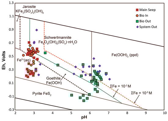 Precipitate formation is the main S sequestration mechanism in Tab-Simco PBS. To gain insight into such processes, we plotted the effluent datasets from Main Seep, Bioreactor Inlet, Bioreactor Outlet, and System Outlet into the Eh–pH diagram for Fe-S-K-O-H system at 25 °C (Figure 7). Previous reports have listed highly variable thermodynamic data for schwertmannite and ferrihydrite [52,53,54] so the Eh–pH stability fields are largely symptomatic.