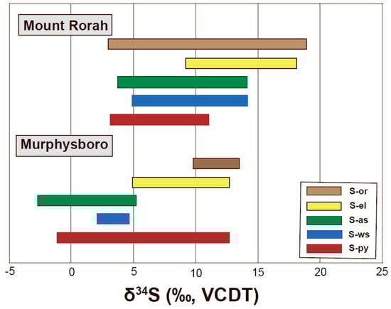 The S-bearing phases in Murphysboro and Mt. Rorah coals exhibit δ34S ranging from −2.7‰ to +19.8‰ [48], which are within the range (δ34S = −10.2‰ to +26.8‰) reported for coals from the Illinois Basin [46,47,48,49,55,56]. The organic sulfur (S-or) and elemental sulfur (S-el) fractions in both for Murphysboro and Mt. Rorah coals were somewhat enriched in 34S (δ34S = +3.4‰ to +19.8‰) whereas pyrite (S-py), water-soluble SO42− (S-ws) and acid soluble SO42− (S-as) fractions were 34S-depleted (δ34S = −2.7‰ to +14.1‰) (Figure 8). The variability in δ34S for pyritic sulfur (δ34S = −1.1‰ to +12.7‰) was due to the presence of several generations of pyrite formed during the different stages of coalification as well as the impact of hydrothermal fluids that precipitated reduced sulfur in Illinois coals [48,49]. Detailed information about the sequential extraction method used to extract different S fractions from coal samples and an in-depth discussion of the results were presented by Singh [48].