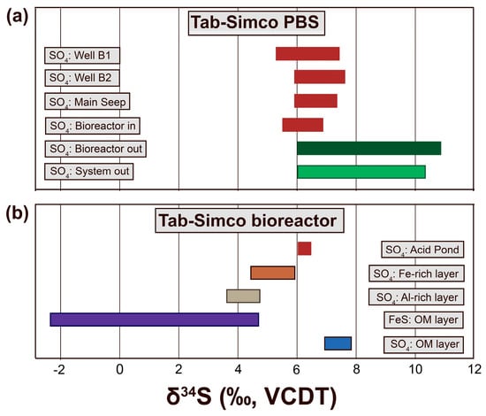 Ranges of sulfur isotopes values of (a) dissolved sulfate (SO42−) in water samples collected at different sampling points across the Tab-Simco PBS; and (b) dissolved and solid sulfur fractions from the Tab-Simco bioreactor collected in August 2013 when the bioreactor media was replaced.