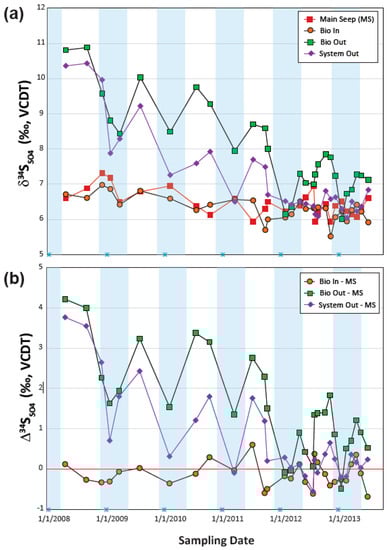 Temporal trends of sulfur isotopes were monitored both as δ34SSO4 at the four monitoring points (Figure 10a) and as sulfur isotopic differences between the Main Seep and the Bioreactor Inlet, Bioreactor Outlet, and System Outlet, which are reported in capital delta notation Δ34S (Figure 10b). The initial Δ34S values were relatively large (Δ34SBio Out-MS ≥ +4‰ and Δ34SSystem Out-MS ≥ +3.8‰), which gradually decreased to negative Δ34S in the winter of 2013, in contrast to the small variations (Δ34SBio In-MS ≤ +1.3‰) recorded at the Bioreactor Inlet over the same time period (Figure 10b).
