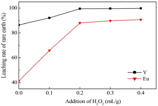The HCl concentration plays an important role in the leaching test. It is clearly shown from Figure 1 that by increasing the concentration of hydrochloric acid, the leaching rate of Y and Eu greatly improved. During the leaching test, the HCl in the solid–liquid interface was first to be consumed, resulting in a great increase of the concentration gradient of hydrochloric acid in the solution, and speeding up the rate of diffusion of hydrochloric acid to solid interface. When the concentration of HCl was 4 mol/L, the leaching rate of Y and Eu reached 99.48% and 88.02%, respectively, so there was no need to increase the concentration of HCl continuously. Figure 2 shows that adding hydrogen peroxide into the solution has a great influence on the leaching rate of rare earth, especially Eu. Hydrogen peroxide can improve the activation energy of the reaction in the solution and accelerate the solid–liquid chemical reaction rate. The leaching rate of Y and Eu achieved 99.48% and 88.02%, respectively, at the hydrogen peroxide amount of 0.2 mL/g. At higher concentrations of hydrogen peroxide, the leaching solution generated a dense oxide film on the surface of the reactants, hindering the reaction; thus, the amount of hydrogen peroxide was ultimately determined to be 0.2 mL/g.