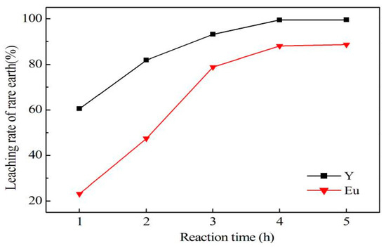 To obtain the best leaching rate of Y and Eu, it is very important to find a suitable leaching temperature and leaching time. As shown in Figure 3, raising the reaction temperature can promote hydrochloric acid to diffuse and penetrate to the phosphor lattice, and accelerate the solid–liquid chemical reaction rate. Simultaneously, while increasing the leaching temperature, the thermal motion of molecules in solution speeded up. It resulted in a corresponding reduction in solution viscosity and reduced the diffusion resistance of soluble substances. The optimal leaching temperature was kept at 60 °C. Figure 4 presents that when the leaching time was 1 h, the leaching rate of Y and Eu were only 60.52% and 23.11%, respectively, due to the leaching solution not having enough time to diffuse to the inside of REE particles. The HCl solution reacted with phosphor completely under the condition of 4 h leaching time.