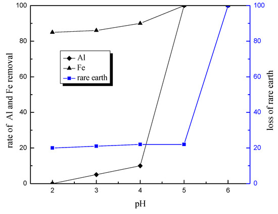 Figure 6 reports the relationship between pH and the yields of impurities and rare earth metals. With the adjustment of pH, Al3+ and Fe3+ were precipitated to some degree, and there existed the loss of rare earth elements (≥30%) at all conditions in these experiments. When pH was adjusted to 5.0, the impurities had been removed completely and the loss of rare earth metals was minimized. With the pH reaching 6.0, the rare earth elements almost completely precipitated.