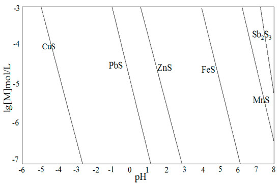 Although the neutralization method had precipitated Al3+ and Fe3+, there was still a mass of heavy metal elements that needed to be removed in the leaching solutions. Figure 7 shows that Cu2+, Pb2+, and Zn2+ could be precipitated with sodium sulfide. We can conclude that the final pH of the leaching solution could be controlled to 5.0, and that the addition of ammonia and sodium sulfide should be added in an appropriate proportion. After pH adjustment, sodium sulfide was directly added into the solutions to control pH up to 5.0.