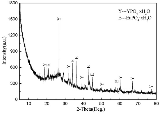 Due to the loss of rare earth, the dark solid precipitates were analyzed with XRF and XRD. Table 4 and Figure 8 show that rare earth element loss existed in the process of removing impurities. The rare earth precipitation during impurities removal may be attributed to two aspects. One reason is that the precipitation of impurities can also entrap Y3+ and Eu3+, and bring them down when they pass. The other reason may be that the rare earth ions can react with phosphate in the case of low pH, and these precipitations have strong adsorptions with metal ions; this result also explains why that in the condition of pH adjustment with ammonia, there existed 30% loss of rare earth all of the way.