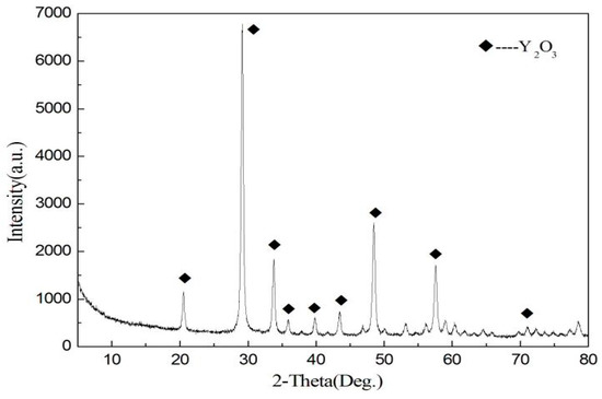 The synthesized precursor material was annealed at 800 °C for 3 h; its powder XRD pattern is depicted in Figure 10. The diffraction pattern clearly shows that the main diffraction peaks of the product correspond well to the body centered cubic structure of Y2O3. As the peak type of the product is sharp and its half height is small, it can be deduced that the crystalline grain of product is uniform and the crystallinity is well.