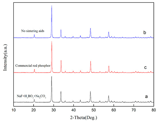 Different proportions of sintering aids (NaF, boric acid, and sodium carbonate) were doped into the precursor, then placed in an agate mortar and grounded to a certain particle size. After that, the mixed powder was calcined at 1400 °C for 5 h in a vacuum. Lastly, the product was chartered with XRD, SEM, and Fluorescence Spectrometer.