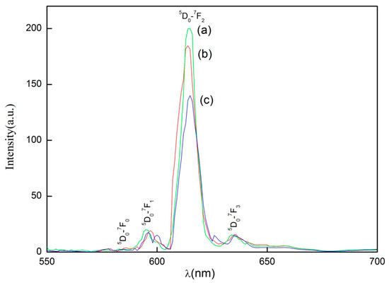 Photoluminescence spectra of (c) Y2O3:Eu annealed at 1400 °C without sintering aids; (b) Y2O3:Eu annealed at 1400 °C with sintering aids; and (a) the commercial red phosphor.