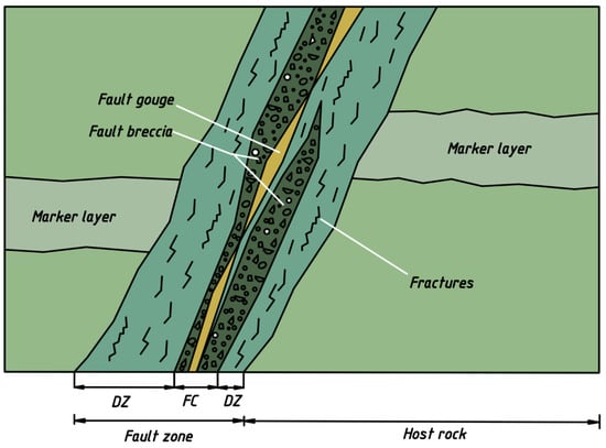 Typical structural elements of a fault zone. Generally, it consists of two parts: damage zone (DZ) and fault core (FC); fault gouge and fault breccia are structure elements within the fault core and sets of fractures are subsidiary structures in damage zones. Modified from Gudmundsson [23].