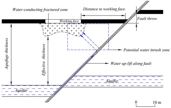 In the process of mining, a water-conducting fault mainly affects water inrush in the following aspects. Groundwater in the aquifer can be raised to a certain height by the water-conducting fault, thus reducing the effective thickness of the aquifuge. In some cases, groundwater may even be directly raised to a coal seam with the aquifuge completely losing its water-resisting function. Sometimes, a large fault may cut through multiple aquifers and these cut aquifers are thus hydraulically linked. If water inrush occurs in such a case, then there will be a large volume of groundwater related.