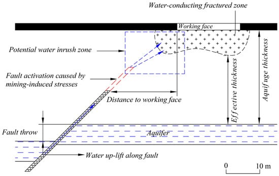A small fault can also lead to water inrush accidents (Figure 3). In most cases, small faults are not connected with a coal seam, however under the coupling actions of mining-induced stresses and hydraulic pressure, the fault reactivation [27,28,29,30,31] can occur and therefore form a water inrush passageway. On the one hand, whether or not a fault reactivation occurs is related to the fault-tip stress concentration scale caused by mining-induced stresses, and on the other hand is related to the relative position between the fault and the working face. As for the fractured water-conducting zone in the floor caused by mining-induced stresses, according to Li’s work [32], by conducting a correlation analysis between the related mining parameters and the size of the fractured zone in 16 working faces, he came to the following regression formula: