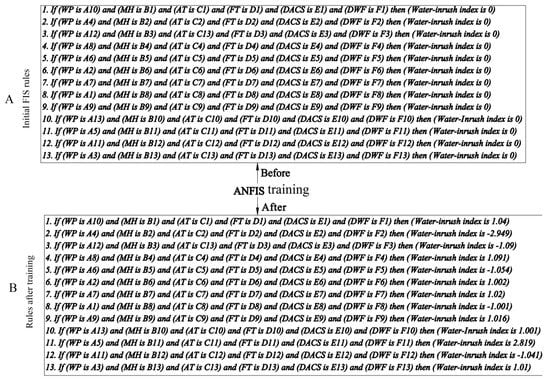 The initial fuzzy inference system (FIS) rules before training and after training. In this figure: (A) refers to the 13 initial FIS rules which are generated by using the subtractive clustering approach and (B) refers to the 13 trained FIS rules which are obtained by using the hybrid training algorithm.