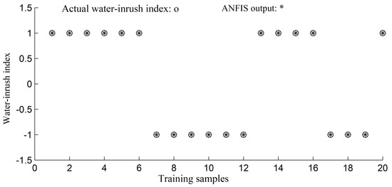 Before starting the training process, first of all, the initial FIS needs to be generated. The key to this step is to determine the number of membership functions for each of the corresponding input parameters, and the shape of the membership functions of the premise part. For the shape of the membership functions, in this study, Gaussian shaped membership function was selected. In general, the grid partition and subtractive clustering are the two ways which have been widely applied for generating the initial FIS. By setting all initial water inrush indexes as 0 and by choosing the subtractive clustering approach to generate the initial FIS, 13 if-then rules were thereby generated as can be seen in Figure 6A. The advantage of the subtractive clustering technique is that a large data set can be automatically distilled into several natural groups, thus resulting in a concise representation of a system’s behavior [44]. A more detailed description of the subtractive clustering technique can be seen in Chiu’s further work [45]. In this study, for generating the initial FIS, the corresponding system parameter values are set as follows: range of influence is 0.65, squash factor is 1.25, acceptance ratio is 0.5 and rejection ratio is 0.15.