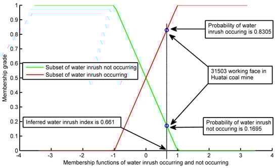 In the process of ANFIS training, 1 and −1 were selected as the desired outputs to represent water inrush occurring and not occurring respectively. Therefore, here, 1 and −1 are considered as two of the critical values to establish the membership function of water inrush. The discourse domain of the membership function is [−3.538, 3.391] (see Figure 10) and there are two fuzzy subsets included within the discourse domain: the subset of water inrush occurring (Equation (10)) and the subset of water inrush not occurring (Equation (11)). Now, with the established membership function of water inrush, the probability of water inrush occurring or not occurring for any new samples can then be determined. Now, an example is given to show how to calculate the probability of water inrush occurring or not occurring for a new sample by using the method of membership function. For example, the water inrush index of the 31,503 working face in Huatai coal mine is 0.661, so its grade of membership to the subset of water inrush occurring is (1 + 0.661)/2 = 0.8305 and to the subset of water inrush not occurring is (1 − 0.661)/2 = 0.1695 (see Figure 11); therefore, for the 31,503 working face in Huatai coal mine, the probability of water inrush occurring is 0.8305 and not occurring is 0.1695.