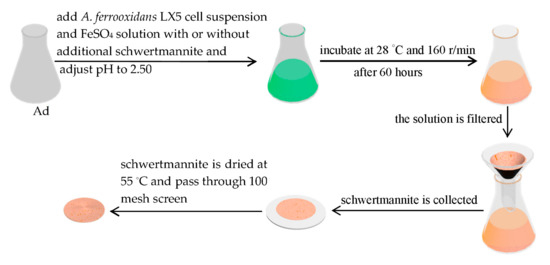 - Liao, Y.H.; Zhou, L.X.; Liang, J.R.; Xiong, H.X. Biosynthesis of schwertmannite by Acidithiobacillus ferrooxidans cell suspensions under different pH condition. Mater. Sci. Eng. C 2009, 29, 211–215. [Google Scholar] [CrossRef]