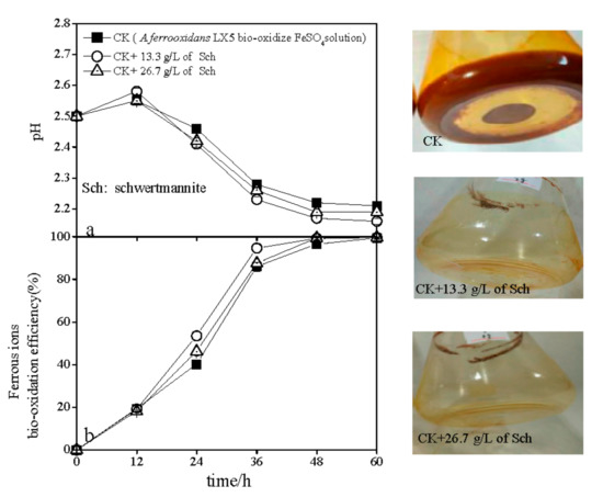 Changes in pH (a) and ferrous ion bio-oxidation efficiency (b) during schwertmannite bio-synthesis without (CK) and with additional schwertmannite. Photographs are of the actual flasks used in different treatments taken at the conclusion of schwertmannite bio-synthesis.