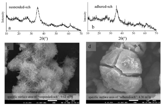 X-ray diffraction patterns (a,b); scanning electron microscopy images (c,d); and specific surface area of suspended-sch (a,c) and adhered-sch (b,d).