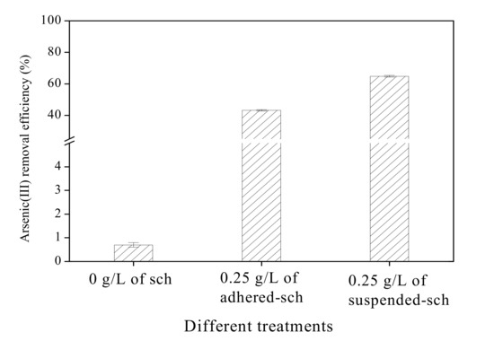 The arsenic(III) removal efficiency of adhered-sch and suspended-sch is shown in Figure 7. No arsenic(III) removal was obvious when no schwertmannite was added to the arsenic(III)-bearing solution system.
