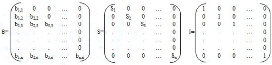 where p and f are the product and the feed size distributions (1 × N vectors), B is the breakage function (N × N lower triangular matrix), S is the selection function (N × N diagonal matrix) and I is the identity matrix. The notation of the breakage function, the selection function and the identity matrix is shown in Figure 1, where bi,j is the mass fraction of the breakage product of size j that reports to a finer size i [18,19].