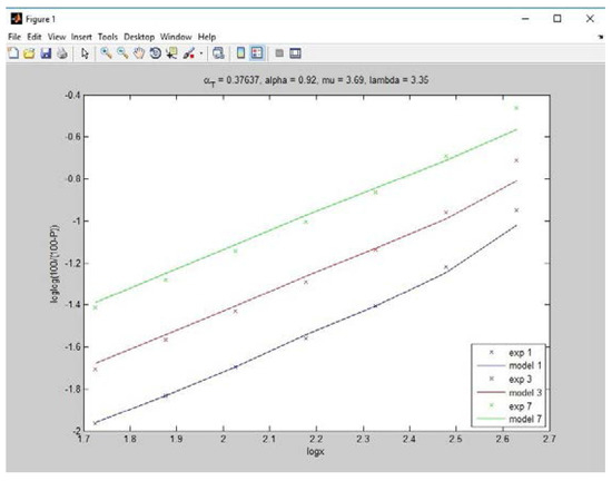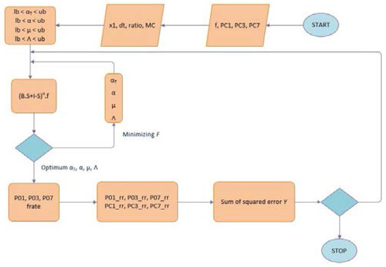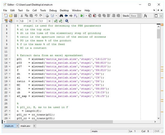 - Non-linear optimization of the objective function F through the “fmincon” function of the MATLAB software, and determination of the optimum αΤ, α, μ and Λ values that minimize the error between experimental size distributions RR and the model, for three different grinding times. The objective function F is defined with the use of Equation (9),where Q = loglog(100/(100 − P)) and P is the cumulative mass % finer than size x, as defined by the RR distribution [15]. The exponents Mod and Exp refer to the experimental data and the estimated results of the model, respectively, while u and i are indicators that refer to the grinding steps and sizes classes, respectively. A flowchart of the MATLAB code is shown in Figure 2.