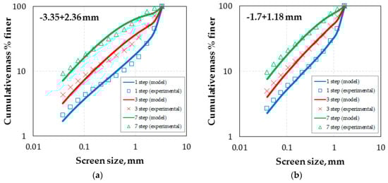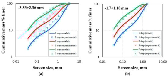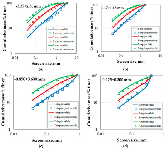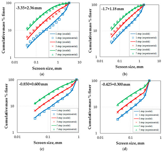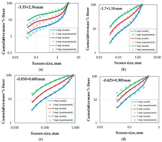 Experimental and estimated particle size distributions of quartzite for each initial feed (d = 25.4 mm). Feed size (a) −3.35 + 2.36 mm; (b) −1.7 + 1.18 mm; (c) −0.850 + 0.600 mm; (d) −0.425 + 0.300 mm.