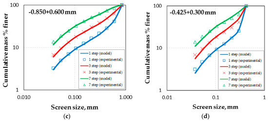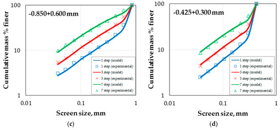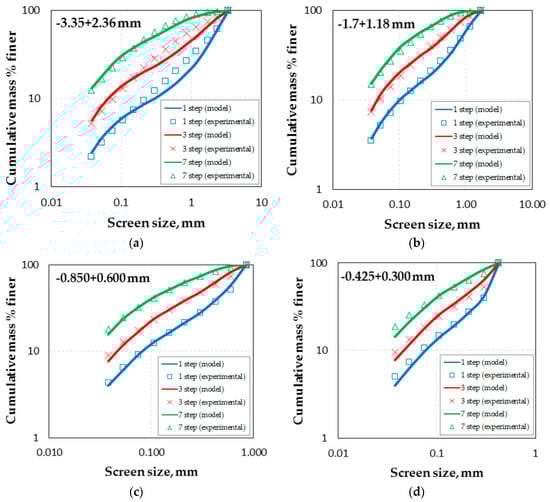 Experimental and estimated particle size distributions of marble for each initial feed (U = 50%). Feed size (a) −3.35 + 2.36 mm; (b) −1.7 + 1.18 mm; (c) −0.850 + 0.600 mm; (d) −0.425 + 0.300 mm.