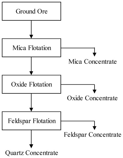 Apart from its origin, feldspar minerals are classified based on their Na, K or Ca ratios as albite (NaAlSi3O8) known as Na-feldspar, orthoclase/microcline (KAlSi3O8), or anorthite (CaAl2Si2O8). Albite mineral is generally used in glass production, while microcline and orthoclase are used in ceramic and porcelain production [3]. Thus, the alkaline and alumina contents of these minerals are very important for usage in these industries. Therefore, in order to ensure these qualifications, the removal of iron and titanium-bearing minerals (mica, iron oxides, titanium oxides, tourmaline) and also the removal of quartz from feldspar is required. In the literature, numerous papers have been devoted to investigating the effect of different parameters such as methods, reagent type, pH adjusters, different flowsheets with/without the usage of hydrofluoric acid (HF) and other flotation-related parameters, in order to obtain higher quality feldspar and quartz products [4,5,6].