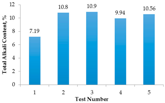 Total alkali (Na2O + CaO) content of feldspar concentrates for each test.