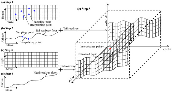 Multi-step interpolation processes, including (a) a 2D interpolation for mineral grade on the tail roadway wall in the strike-height coordinate frame; (b) a 1D interpolation for interpolating floor altitudes of the tail roadway in the strike-altitude coordinate frame; (c) a 2D interpolation for the mineral grade on the head roadway wall in the strike-height coordinate frame; (d) a 1D interpolation for interpolating floor altitudes of the head roadway in the strike-altitude coordinate frame; and (e) a 3D linear interpolation for the mineral grade between roadways in the strike-dip-altitude coordinate frame.