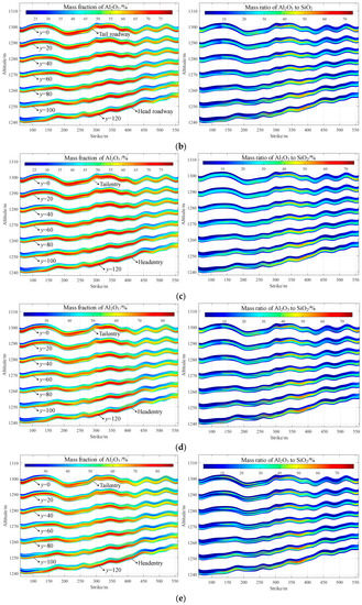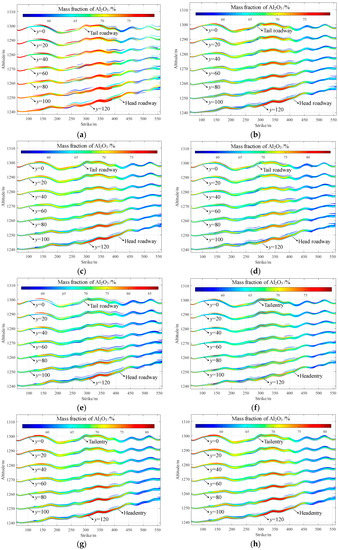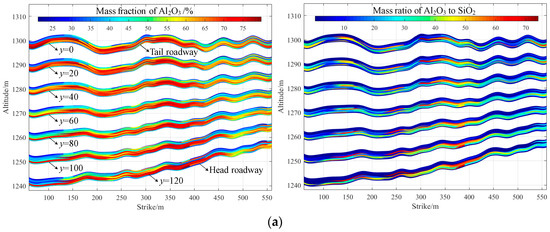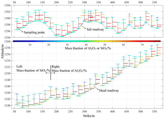 The above interpolation method is applied to interpolate the grade distribution in the bauxite seams of the Wachangping bauxite mine (China). The 1102 longwall panel is 500 m in length (from the stop-line of mining at x = 59.501 to the start-line at x = 559.501) and 120 m in width (from the tail roadway at y = 0 to the head roadway y = 120) in the Wachangping bauxite mine, as shown in Figure 2. The mineral composition of the bauxite ore or bauxitic rock was measured in 53 groups of ore samples excavated from the roadway walls, which include 27 groups from the tail roadway and 26 groups from the head roadway. The mass fraction of Al2O3 and SiO2 are achieved and depicted in Figure 3.