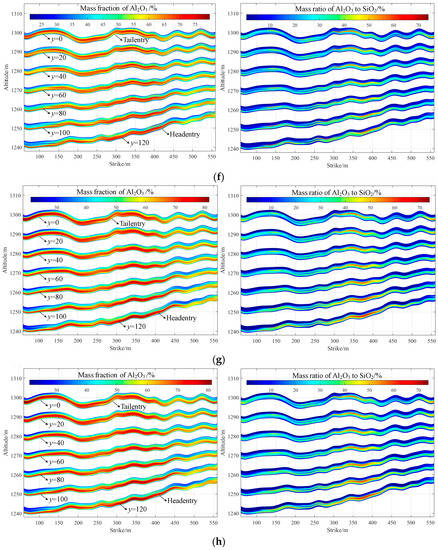 Using the scattered sampling data measured from the roadway walls, the multi-step interpolation algorithm was proposed to establish a 3D grade distribution model of the mineralized seam, based on the coupled interpolation method comprising of the 2D nearest neighbor, linear, natural neighbor, cubic, biharmonic spline; IDW, SK, or OK, 1D biharmonic spline; and 3D linear interpolations. As the examples show, the grade distribution at the cross-sections of y = 0, 20, 40, 60, 80, 100, and 120 m in the mineralized seams are shown in Figure 4. The grade values are expressed by the two indices, namely the mass fraction of Al2O3 marked as Wa and the mass ratio of Al2O3 to SiO2 marked as Wa/s. Corresponding to the 2D nearest neighbor, linear, natural neighbor, cubic, biharmonic spline, IDW, SK, and OK interpolation methods adopted in the interpolating processes for grade distributions on roadway walls relative to floors, the slice maps of the grade distributions are shown in Figure 4a–h, respectively. It is evident that the bauxite seam presents a distinct stratiform structure, because it belongs to a sedimentary mineral deposit embedded in the sedimentary strata.