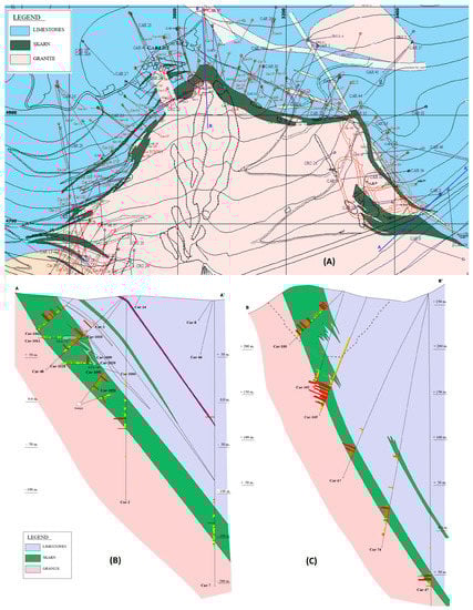 - Martın-Izard, A.; Paniagua, A.; García-Iglesias, J.; Fuertes-Fuente, M.; Boixet, L.L.; Maldonado, C.; Varela, A. The Carlés copper-gold-molybdenum skarn (Asturias, Spain): Geometry, mineral associations and metasomatic evolution. J. Geochem. Explor. 2000, 71, 153–175. [Google Scholar] [CrossRef]