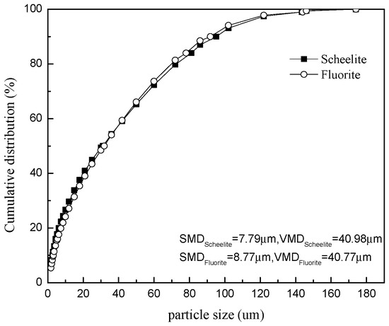 Pure scheelite was obtained from Ke Muda Mining Ltd. in Tongde County, Qinghai Province, China, and pure fluorite from a mineral powder factory in Changsha, Hunan Province, China. The samples were firstly handpicked, crushed, ground, screened, and finally stored in sealed glass bottles. Elemental analysis showed that the purity of the scheelite and fluorite samples was 94% and 99%, respectively. The particle-size distributions of the samples are displayed in Figure 1. The ground samples were wet-sieved, and −74 µm-sized fractions with specific surface areas of 2533 cm2·g−1 for scheelite and 2251 cm2·g−1 for fluorite were collected and used in micro-flotation tests. Some of these particle fractions were further ground in agate mortar to obtain −2 µm particles for zeta potential measurements and XPS analysis.