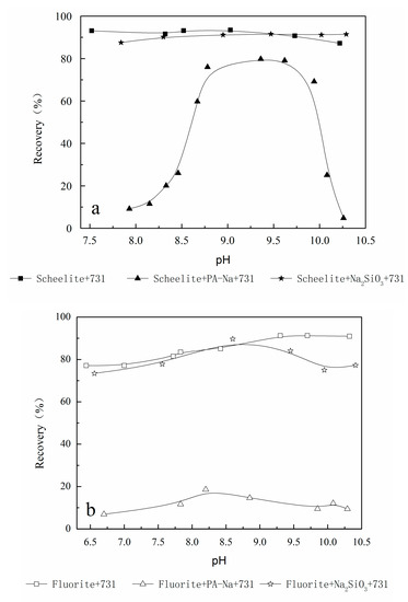 To compare PA-Na with conventional inhibitor sodium silicate, with 25 mg/L PA-Na or 500 mg/L sodium silicate as an inhibitor and 75 mg/L 731 as a collector, single-mineral flotation of scheelite and fluorite was carried out as a function of pH in the absence and presence of PA-Na or Na2SiO3 (Figure 4). With Na2SiO3 as the inhibitor, the recovery of scheelite had stable responds at all pH ranges (Figure 4a), but the recovery of fluorite increases as the pH increases (Figure 4b). By contrast, the pH values for the optimum recovery of scheelite and fluorite are different. The flotation recovery of scheelite and fluorite increases slightly as the pH increases and then decreases slightly. The experimental results of scheelite are similar to those reported by Feng [26]. With PA-Na as the inhibitor, the scheelite recovery is about 80.00% in a wide pH range from 8.7 to 10. By contrast, PA-Na exhibits a strong selective depression on fluorite with a maximum recovery of 18.59% at pH 8.2. Na2SiO3 has a weak selective depression on the recovery of scheelite and fluorite. Na2SiO3 has a certain inhibitory effect on fluorite at pH > 9.5, making the recovery of fluorite reduce by about 10%. With Na2SiO3 as the inhibitor, the minimal recoveries of scheelite and fluorite are over 87.56% and 73.42%, respectively. In short, the single-mineral flotation results show PA-Na has a more preferential flotation separation of scheelite from fluorite than Na2SiO3 at pulp pH between 8.7 and 10.