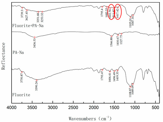 According to the IR spectra, it can be determined whether there is a chemical reaction between the reagent and the mineral surface [26]. In order to study the mechanism of Pa-Na in the flotation separation of scheelite from fluorite, the IR (Infrared) spectrums of these two minerals before and after interacting with PA-Na are measured, and the results are shown in Figure 6 and Figure 7.