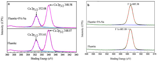 Figure 11 presents the binding energies of the elements in fluorite before and after reacting with PA-Na, and these findings suggest that the changes in the peak intensities of Ca2p3/2, Ca2p1/2, and F1s are induced by PA-Na addition. The binding energy of the Ca2p3/2 peak increases from 348.07 to 348.58 eV, and the binding energy of the Ca2p1/2 peak also increases from 351.58 to 352.08 eV, showing corresponding chemical shifts of 0.51 and 0.5 eV, relative to the binding energies before PA-Na addition (Figure 11a). When the chemical shift is greater than the experimental error of 0.3 eV, it indicates that a chemical reaction occurs; the greater the chemical shift, the stronger the reaction [38,39]. The increase in the binding energy of the fluorite surface after PA-Na addition implies the existence of a strong force of adsorption on fluorite. In the F1s spectra, the chemical shift of the binding energy is 0.2 eV, which is less than the experimental error of 0.3 eV (Figure 11b). Thus, PA-Na significantly affects the Ca2p of the inner electron binding energy of fluorite but does not influence the F1s.