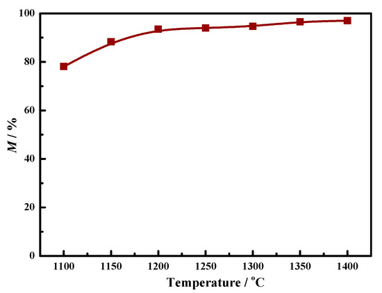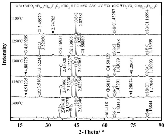 - From the characterization and analysis of XRF, ICP-AES, XRD, SEM, and EDS, it is observed that the amounts of metallic iron particles obviously increased and the accumulation and growing tendency were gradually facilitated with the increase in the temperature from 1100 °C to 1400 °C. It is also found that the titanium oxides were gradually reduced and separated from titanium-ferrum oxides during reduction. In addition, silicate phases, especially calcium silicate phases, transformed from calcium ferrite at 1100 °C, were observed, and gradually aggregated with the increase in the temperature from 1200 °C to 1350 °C, but some silicate phases infiltrated into metallic iron at 1400 °C, as it appears that carbides, especially TiC, could probably contribute to the sintering phenomenon becoming serious.