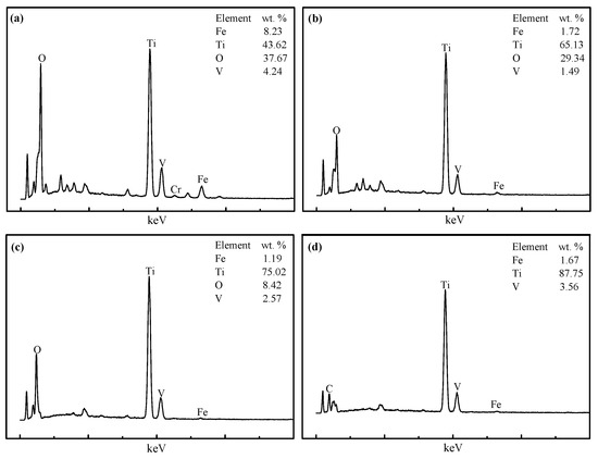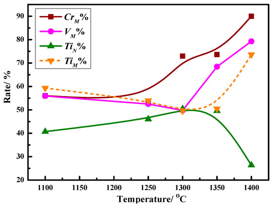 - From the comprehensive study, it was obtained that the transformation behavior for valuable elements was as follows: Fe2VO4 → VO → V → VC; FeTiO3 (→ FeTi2O5) → TiO2 → TiC; FeCr2O4 → Cr → CrC; FeTiO3 (→ FeTi2O5) → Fe0.5Mg0.5Ti2O5; (Fe3O4/FeTiO3 →) FeO →Mg0.77Fe0.23O.